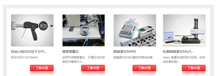 產(chǎn)品中心界面有清晰的產(chǎn)品類目:通用量具,在線測(cè)量,精密設(shè)備,計(jì)量設(shè)備,理化試驗(yàn)等,每款產(chǎn)品